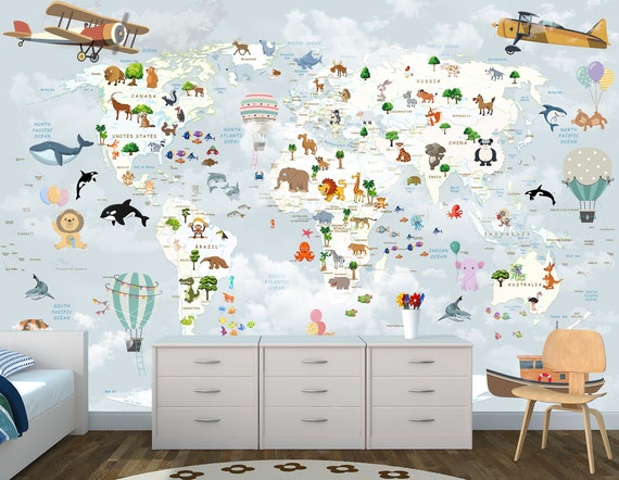 Kids Room Accent Wall Decor Animal World Map Wallpaper Peel and